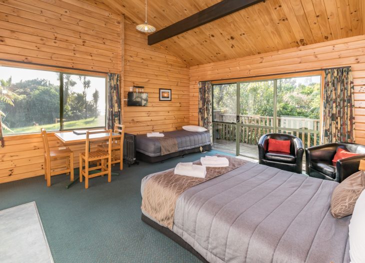 Spacious Timber Unit with a Queen bed only . Opens onto a private deck. A well equipped kitchenette, table and chairs. Relax in 2 comfortable tub chairs –enjoy the green fern environment. Private bathroom with shower, vanity unit and toilet.